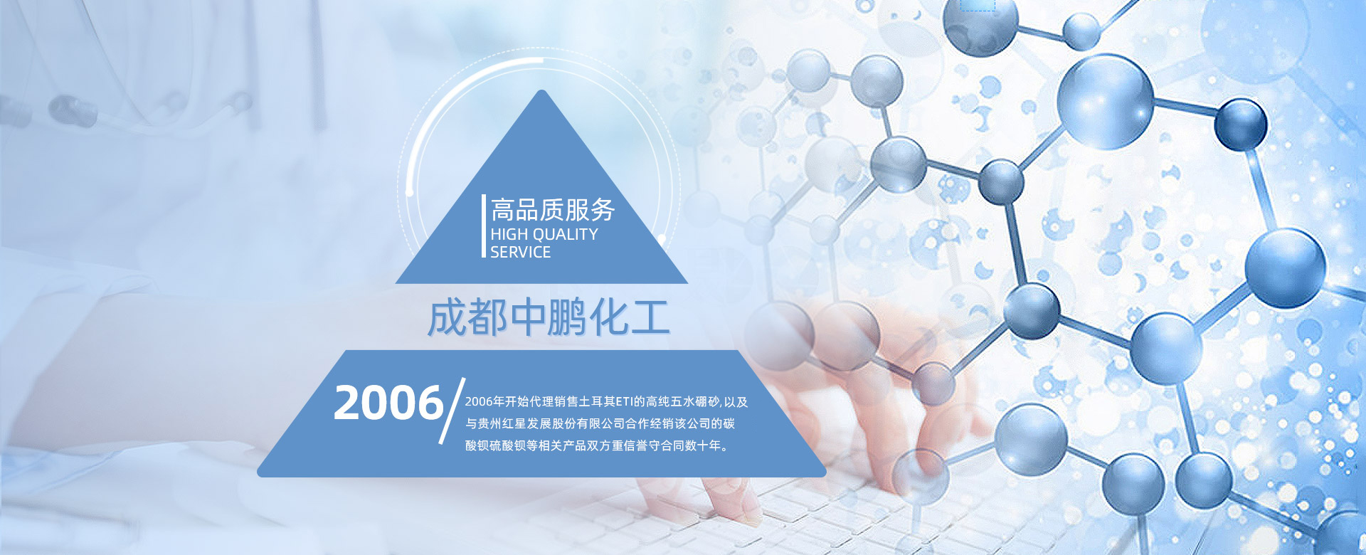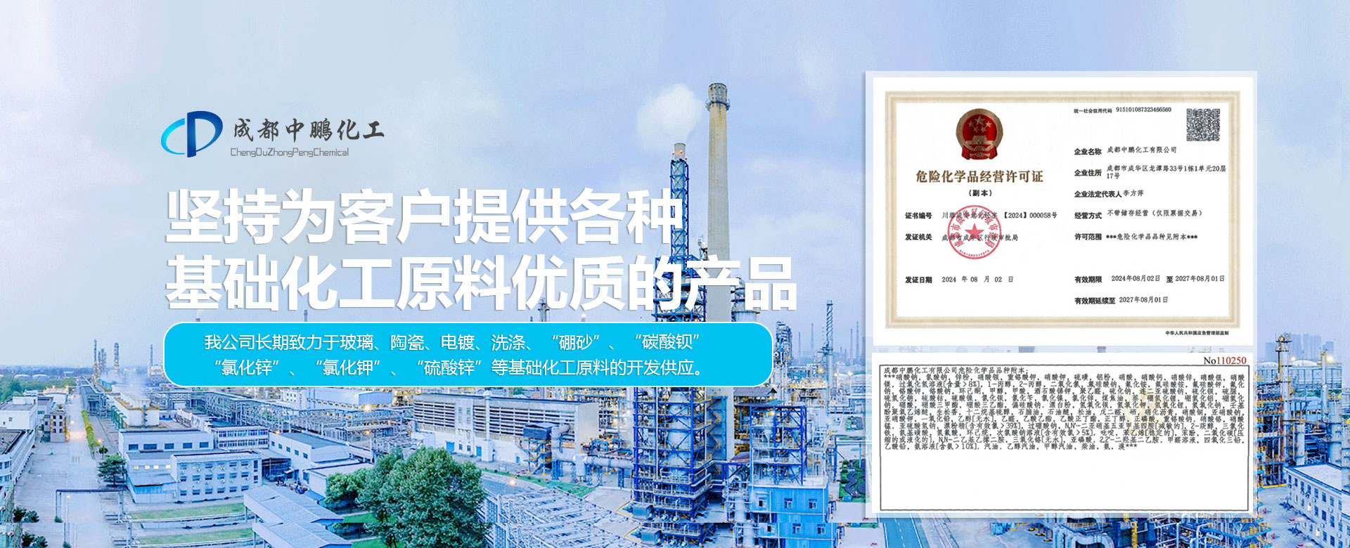 成都中鵬化工有限公司成立于2001年,位于成都市新都區(qū)木蘭木名商塑化城2棟11號(hào),公司成立16年以來,一直堅(jiān)持為客戶提供各種基礎(chǔ)化工原料的產(chǎn)品。我公司長期對于玻璃、陶瓷、電鍍、洗滌、“硼砂”、“碳酸鋇”、“氯化鋅”、“氯化鉀”、“硫酸鋅”等基礎(chǔ)化工原料的開發(fā)供應(yīng)。 公司現(xiàn)在員工上百人,在全國擁有多個(gè)營銷體系和完善的售后服務(wù)體系,長期以來,通過為客戶提供各種基礎(chǔ)化工原料的產(chǎn)品,形成了良好的合作關(guān)系...